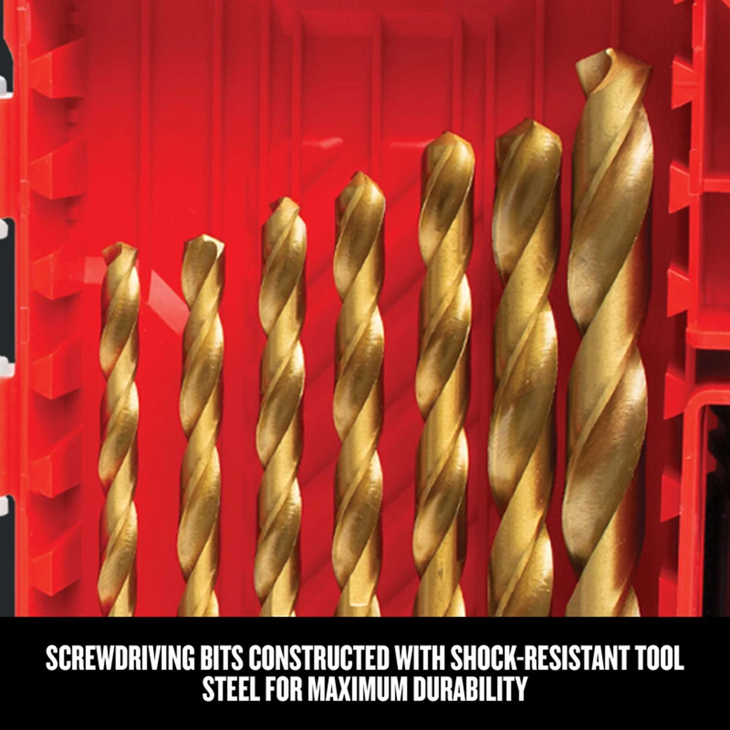 | What's Included | (14) Titanium Nitride Coating Drill Bits: (2) 1/16 in., (2) 1/8 in., 9/64 in., 5/32 in., 11/64 in., 3/16 in., 13/64 in., 7/32 in., 15/64 in., 1/4 in., 5/16 in., 3/8 in.; (6) 1 in. Standard Bits: (2) PH2, (2) SQ2, T20, T25; (1) 3 in. Locking Magnetic Holde |