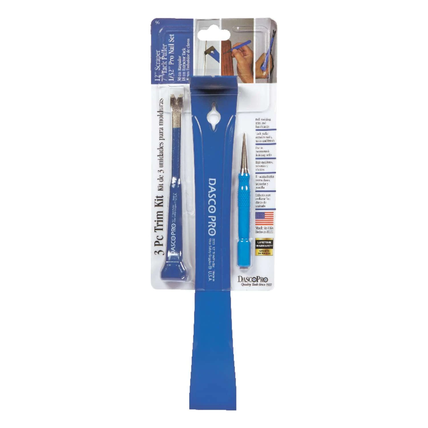 Dasco Pro offers the most frequently used and popular items in tool kits. Professionals and homeowners alike can grab a tool kit with confidence that they have the most sought after tool for the job. Scraper’s thin profile allows it to slide under moldings, trim and casework then lift it with minimal marring to the underlying wall Use the wide, sharp corners of the scraper to remove excess paint in hard to reach areas Made with strong spring steel to remove stubborn nails and other fasteners Use the tack puller’s forged V-chisel tip to remove tacks, staples, brads, trim clips and upholstery Use the nail set’s concave tip for fast positive setting of nails and brads Nail set’s textured non-slip grip reduces shock