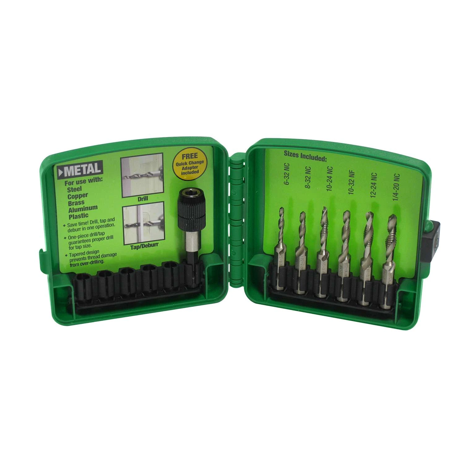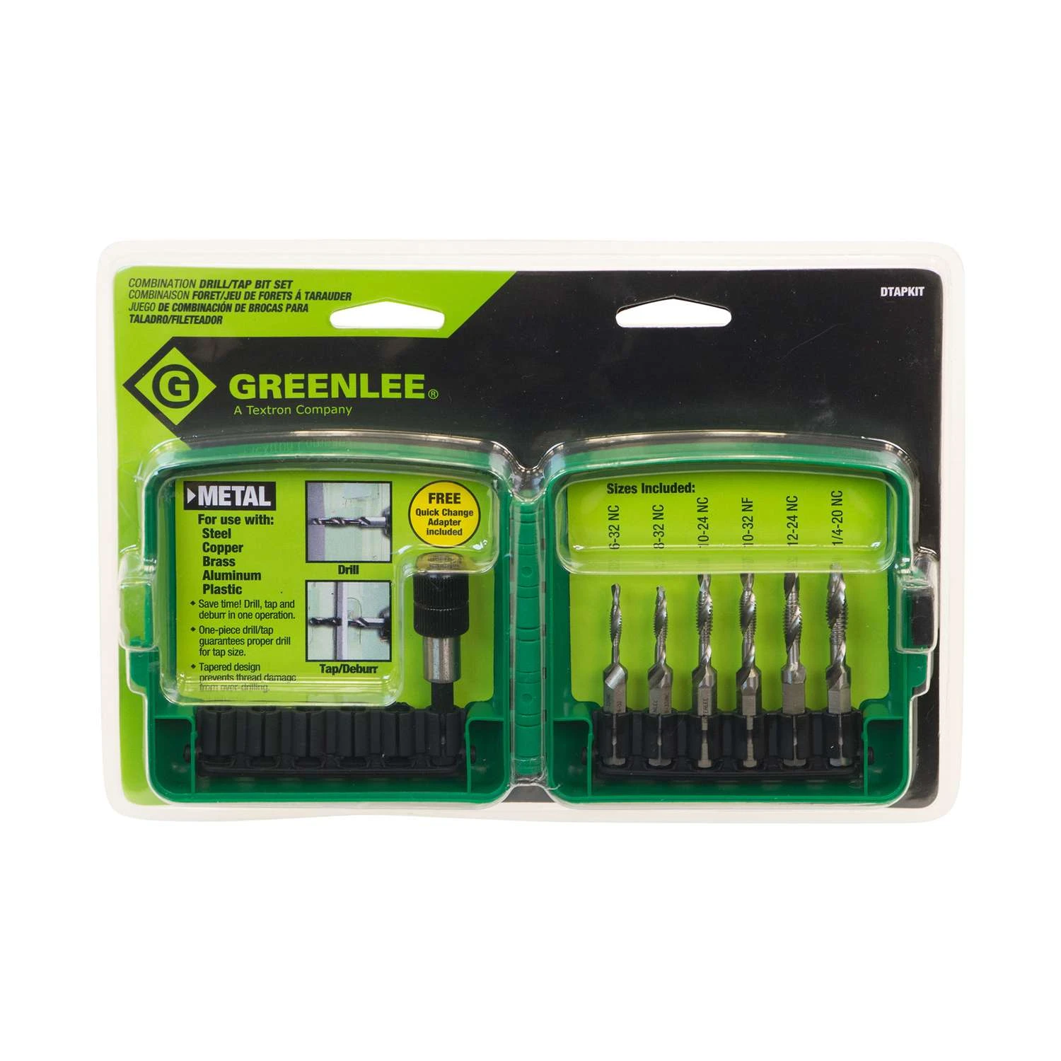Greenlee Drill/Tap Bits tap holes up to 4 times faster than traditional methods.Split-point tip resists walking and penetrates material faster.Titanium Nitride coating ensures that the bits run cooler, drill faster and last longer. Back tapered beyond tap to prevent thread damage from over-drilling Deburr or countersink also provided on bit beyond back taper High quality hex shank to ensure strong connection to drill chuck Designed to tap up to 10 gauge metal Quick change adaptor included in both metric and standard kits Complete hole drilling, tapping and deburring countersinking in one operation with power drill saves labor and time Made from hardened high-speed steel carbon steel for longer life Sizes – 6-32, 8-32, 10-24, 10-32, 12-24, 1/4-20