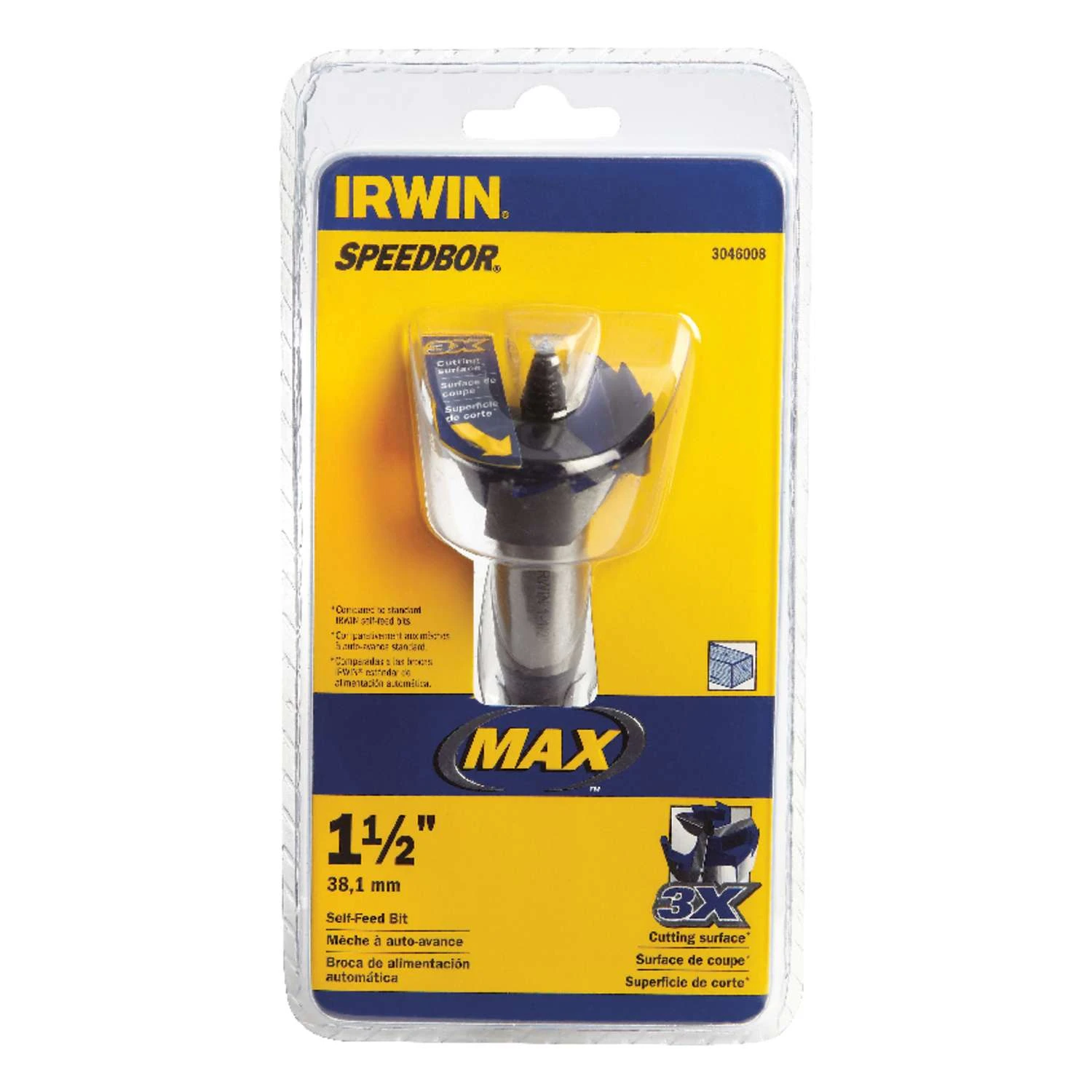 The Irwin Speedbor maximum speed wood drilling bit 1-1/2 in. size 3X Cutting edges extends bit life compared to standard Irwin self-feed bits Aggressive screw pitch 7/16 in. quick change impact shank