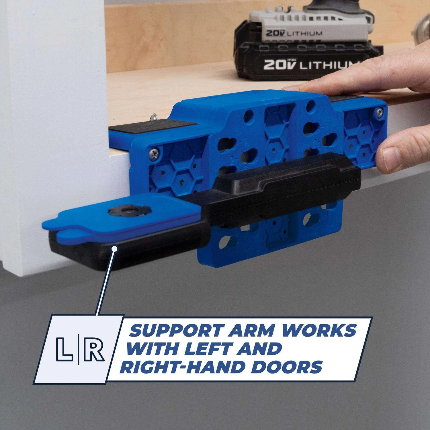 Get an extra helping hand for installing cabinet doors with the Kreg Cabinet Door Mounting Jig. It makes the job of installing cabinet doors a breeze – whether you’re working with face frames or frameless cabinets. The jig features a support arm that helps you hold the door with one hand, while your other hand is free to mount the hinges to the cabinet. The Cabinet Door Mounting Jig also allows you to position your cabinet doors precisely. Adjust the support arm to one of the nine different positions to get your doors placed exactly where you want them. There’s one setting for inset doors and eight more at 1/4″ increments, so you can support doors that overlay the cabinet face up to 2″. Use one shim to move the door up by 1/16″ or 1/8″ – or combine both shims for 3/16″ of adjustability. Attach hinges easily while the jig helps hold the door in place The Cabinet Door Mounting Jig comes with two micro-adjustment shims for even more fine-tuning It works with both left-hand and right-hand doors
