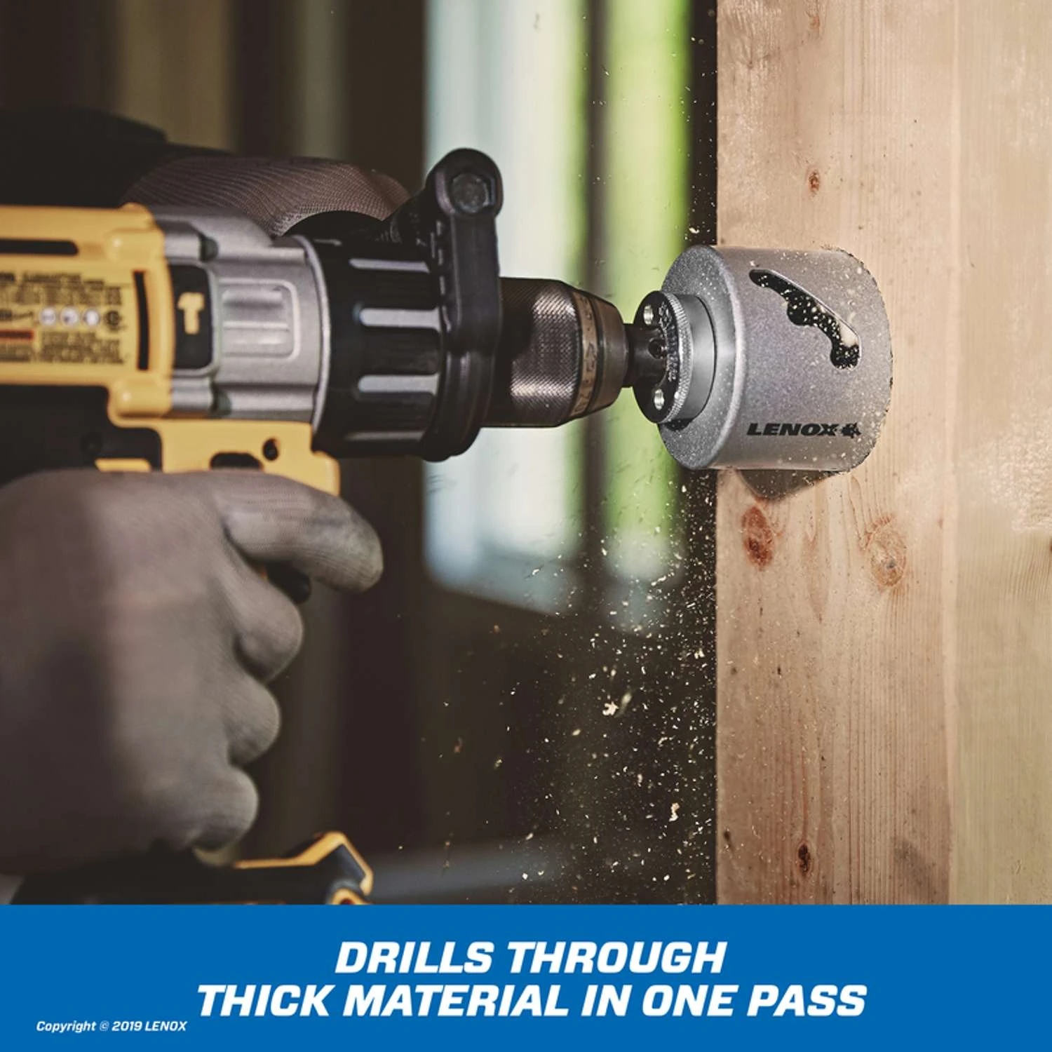 Lenox has over a century of cutting expertise, delivering solutions that make our tradesmen more productive. Lenox has continued to lead the way in the bi-metal hole saw category and is now redefining performance again with the introduction of a new carbide hole saw platform. Up to 50x life: high performance carbide is welded to the cutting edge for durability and to help prevent tooth loss Extremely versatile: aggressive tooth design drills through wood, steel, stainless, cast iron, fiber cement & plaster Fast, east plug removal: patented speed slot Staircase design has multiple leverage points for easy plug ejection Drills through thick materials in one pass: tall body easily drills through 2x dimensional lumber for rough-in work Use for 2L, 6L Snap-Back arbor and 2L, 3L 6L Standard Arbor Recommend RPM for Aluminum(600 rpm), Stainless Steel (220 rpm), Fiberglass (90 rpm), Ceramic Tile (180 rpm), Cast Iron (70 rpm)