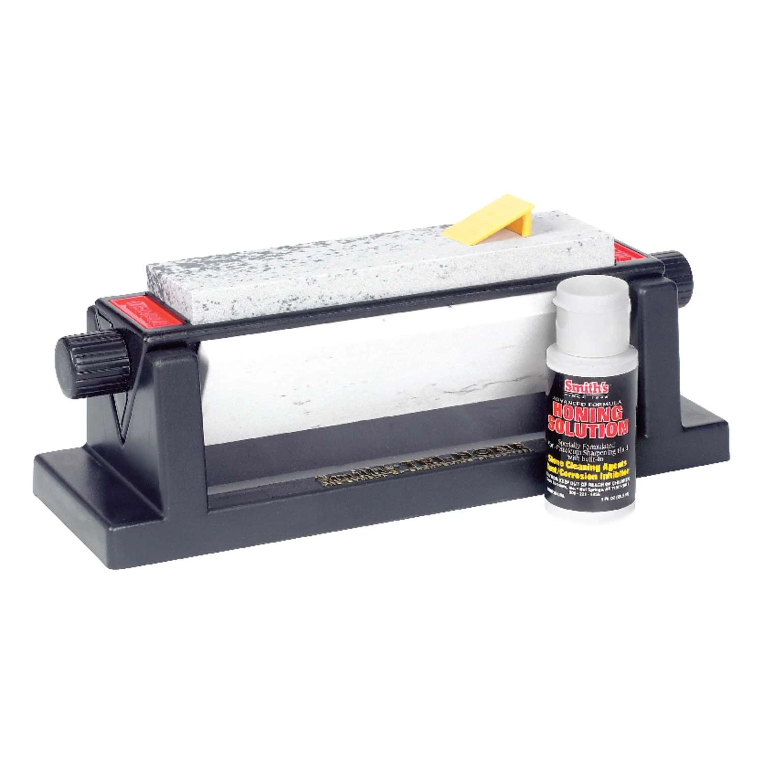 Smith’s 3-stone sharpening system features a 6 inch medium Arkansas stone, 6 inch fine Arkansas stone, and 6 inch coarse synthetic stone mounted on a molded plastic triangle with handles on the end for easy stone rotation and easy to read stone identification. The sturdy molded plastic base has nonskid rubber feet for safety, “V” trough to catch the oil drippings, and is easy to clean. A bottle of premium honing solution and a sharpening angle guide are also included. 3 sharpening stones (coarse, medium, and fine) mounted on plastic triangle for easy stone rotation and identification Molded plastic base with nonskid rubber feet for safety Molded plastic base with non-slip rubber feet for safety and trough to catch the excess honing solution V trough to catch the solution Premium honing solution cleans and protects the sharpening surfaces Sharpening angle guide ensures correct angle every time